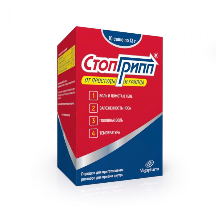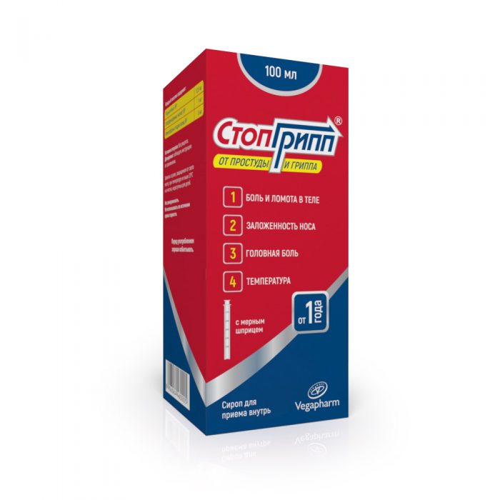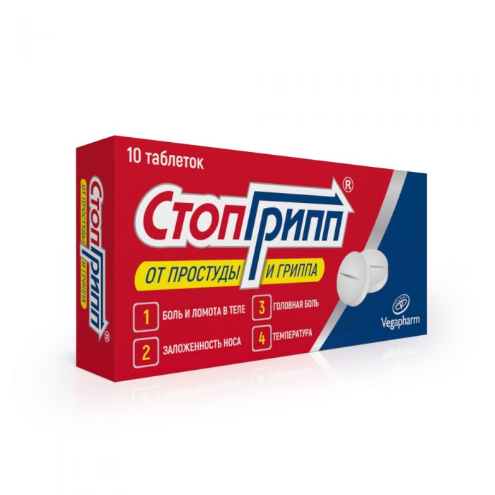 Стопгрипп — жаропонижающее, обезболивающее, антигистаминное, сосудосуживающее, противовоспалительное комбинированное лекарственное средство. Эффект обусловлен действием компонентов, входящих в состав препарата — парацетамола, аскорбиновой кислоты фенирамина малеата.